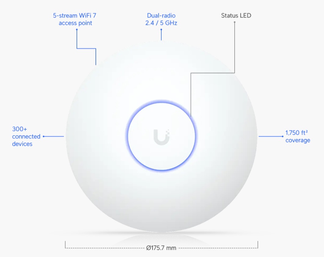 UniFi 7 Long Range è un Access Point ad alte prestazioni che sfrutta la tecnologia avanzata Wi-Fi 7 per fornire una potente copertura wireless agli ambienti aziendali. Offre una velocità radio aggregata fino a 4,3 Gbps con radio a 5 GHz (3x3) e 2,4 GHz 2x2. L'U7-LR si integra perfettamente in qualsiasi ambiente e può essere montato in ambienti interni e semi-esterni.