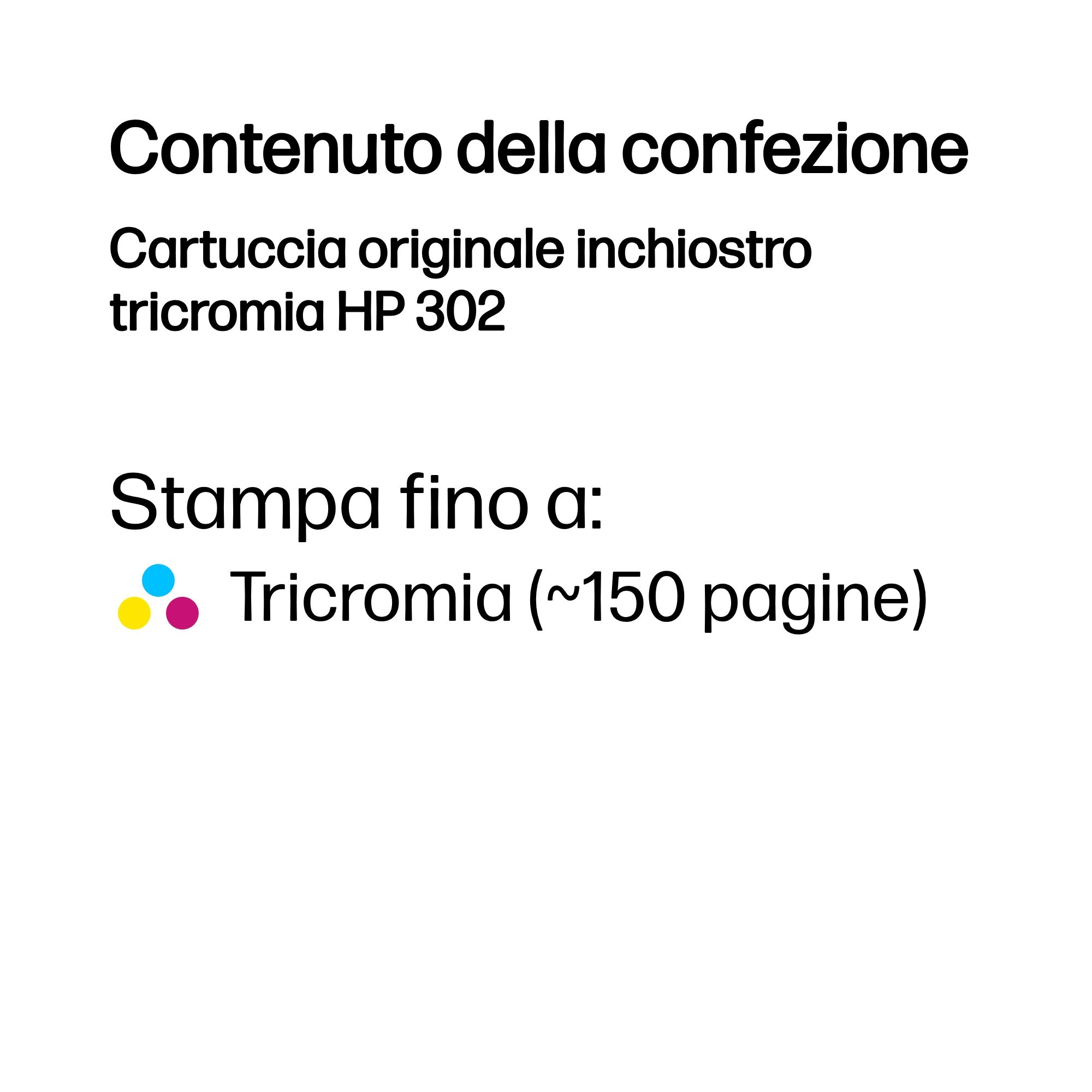HP Cartuccia originale inchiostro tricromia 302, Resa standard, Ciano, Magenta, Giallo, Inchiostro colorato, 4 ml, 1 pz, Confezione multipla
