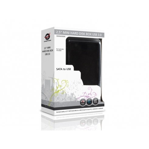 Conceptronic 2,5" Harddisk Box Mini USB 3.0. Tipo di prodotto: Custodia per Disco Rigido (HDD). numero di dispositivi di archivio supportati: 1, Dimensione del dispositivo di archiviazione: 2.5", Interfacce dell'unità di archiviazione supportate: SATA, Seriale ATA II, Serial ATA III. Velocità di trasferimento dati: 5 Gbit/s. Colore del prodotto: Nero