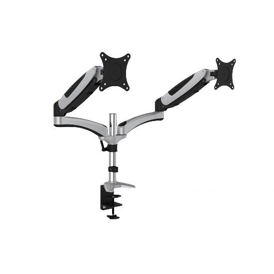 digitus supporto da tavolo universale duale led/lcd con molla a gasbraccio da tavolo universale con molla a gas per due video per la regolazione flessibile su 4 livelliil morsetto da tavolo universale consente l'installazione di schermi lcd e led di tutte le marche fino a 69 cm. grazie al braccio con molla a gas, il monitor pu? essere fissato a qualsiasi altezza. ? sufficiente fare attenzione alle dimensioni vesa e al peso del monitor per scegliere il supporto appropriato. gestione del cavo integrata nella staffa. compatibile con gli standard vesa 75 x 75 e 100 x 100 mm fino a un carico massimo di 8 kg peso: 4,7 kg dimensioni: 150 x 890 x 320 mm