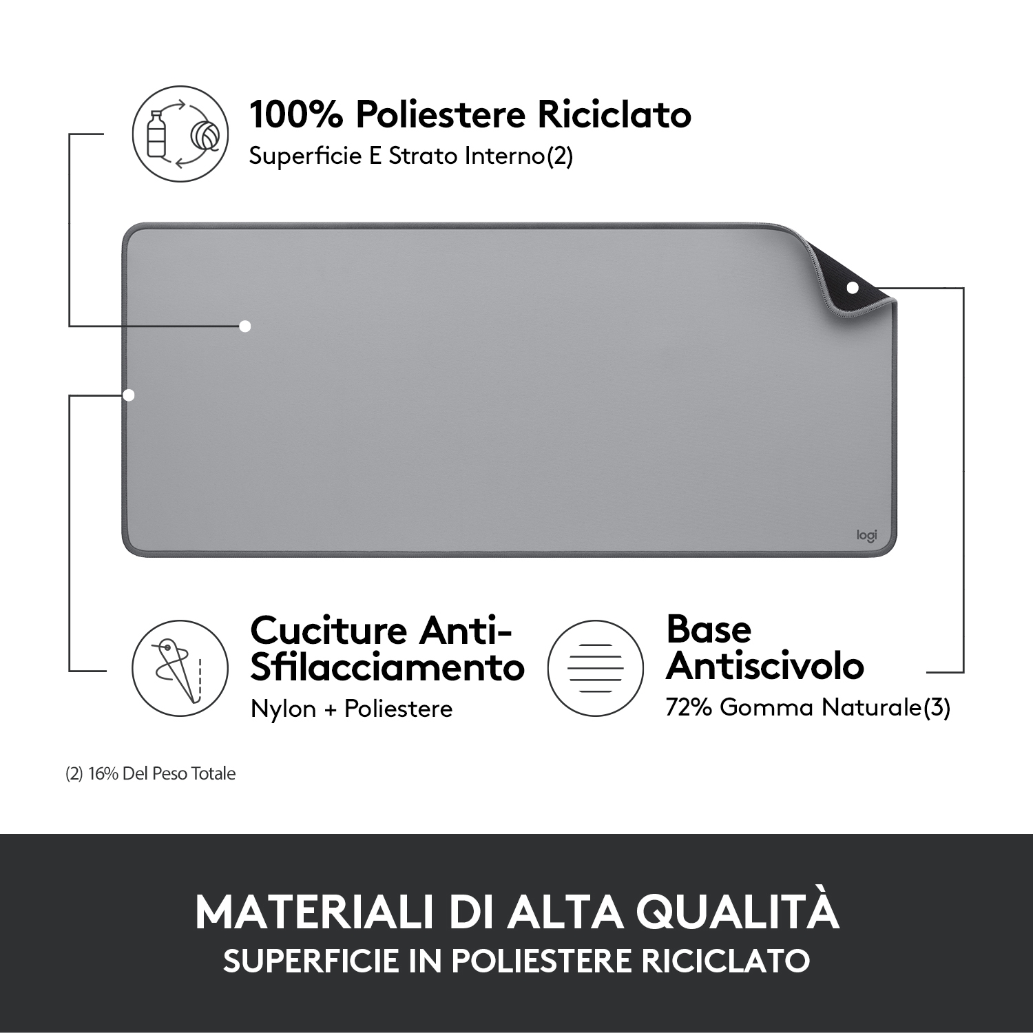 Logitech Desk Mat Studio Series, Grigio, Monocromatico, Nylon, Poliestere, Gomma, Barra appoggiaferro antiscivolo