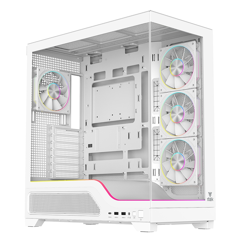 itek SHOWBUI WAVE 82W. Fattore di forma: Tower, Tipo: PC, Colore del prodotto: Bianco. Posizione alimentazione: Fondo. Ventole laterali installate: 3x 120 mm, Diametro delle ventole laterali supportato: 120,140 mm, Rear fans installed: 1x 120 mm. Dimensioni di hard disk drive supportati: 2.5,3.5". Larghezza: 238 mm, Profondità: 456 mm, Altezza: 500 mm